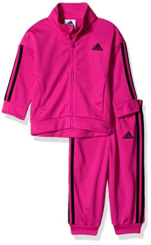 The tricot jacket set includes a full zip front jacket with mock neck, drop shoulder sleeves, princess seams with on seam pockets, and applied stripes. Embroidered Adidas brand mark at left chest. Jogger-style pant features elastic waistband, rib cuffs, applied stripes, and embroidered Adidas brand mark at left front.