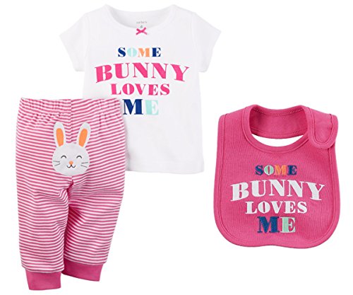 This outfit is perfect for celebrating Baby’s First Easter. She will look adorable in this tshirt with words “Some Bunny Loves Me”. Pants with pink and white stripes feature adorable Bunny embroidered on butt. She will keep clean with matching “Some Bunny Loves Me” bib with velcro closure. What a perfect gift for that special new baby in your life. 100% Cotton, Machine Washable.