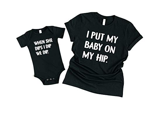 I Put My Baby On My Hip. – Mommy and Me When She Dips I Dip We Dip – Baby High Quality Printed Transfer, Professionally pressed. This cute mommy and me/ baby set is an adorable gift or self purchase sure to make people laugh. Your purchase includes BOTH the Mom Shirt and the Baby Bodysuit. Choose your color and Adult size, as well as your baby one piece size. The Adult Shirt is a Unisex T by Bella Canvas ***We use the Unisex style shirts. We find them to fit the best and are a customer favorite! If you like a form fitting shirt, please size down one from your size in Womens. The Baby One Piece is a premium Rabbit skins snap bodysuit. Product Details: White is sewn with 100% cotton thread CPSIA compliant- tracking label in sideseam Reinforced three-snap closure Double-needle ribbed binding on neck, shoulders, sleeves and leg openings Flatlock seams 100% combed ringspun cotton 1×1 baby rib