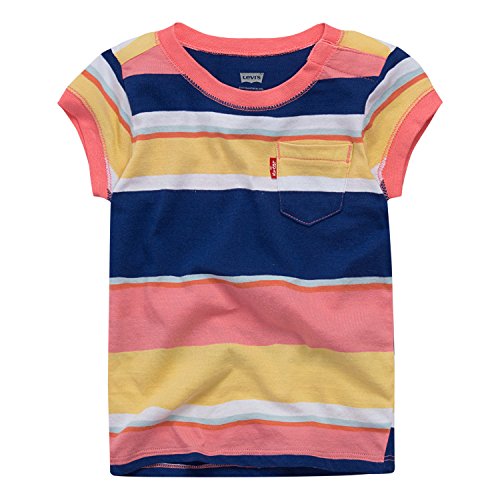 Levi’s girls ringer tee includes a convenient front pocket and a playful all-over print design with rainbow foil.
