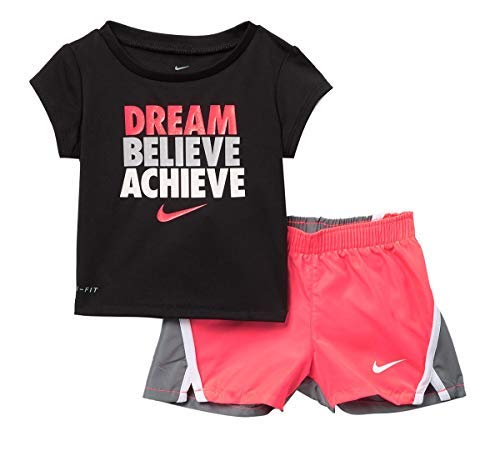Comfortable and fun for sporty days and beyond, Nike’s two-piece set pairs a cheerful graphic-print T-shirt with breathable mesh shorts for a cute athletic look.