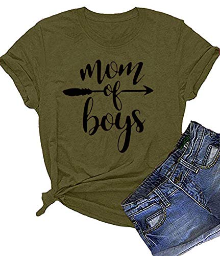 Amandon Mother Days Tees Womens Mom of Boys Round Neck Short Sleeve Graphic Shirts for Mama Shirts Olive