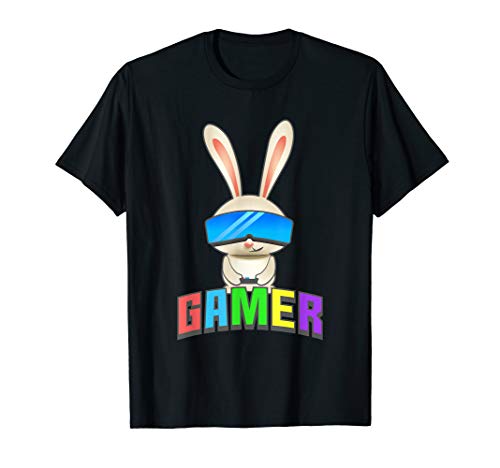 • This tshirt shows an easter bunny with virtual reality glasses and it says in retro font gamer. Makes a great gift for every gaming husband, wife, boyfriend, brother, father, husb, man, woman, boy, girl, kid and youth on fathers or mothers day