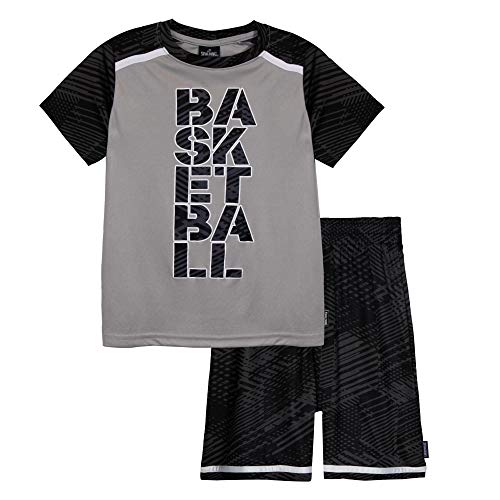 - Grey and black crewneck top and shorts 2 piece set with “Basketball” text graphic