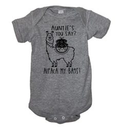 A cute heather gray bodysuit with “Auntie’s You Say? Alpaca My Bags” and Alpaca print in black. Makes a great gift! Product Features MATERIAL: 5.0 ounce, heather is 88%