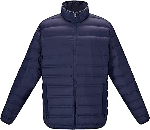 Elkhomy Mens Thin Puffer Coat With Pocket Portable Standing Collar Duck Down Winter Coat Lightweight Windproof Heat Retaining (Navy, L)