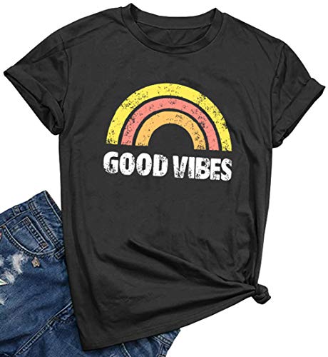 FACETREE Women Good Vibes Graphic Cute T Shirt Girl Tops Black Medium