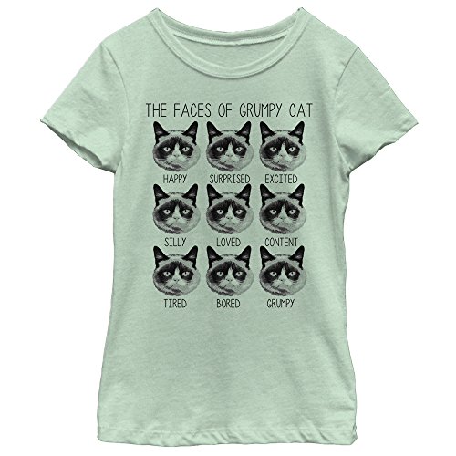 No one else has quite the poker face that Grumpy Cat does. Explore the moods of the Grumpy Cat many faces mint green t-shirt. Enthusiasts will enjoy the range of emotions printed on this tee: happy, surprised, excited, silly, loved, content, tired, bored, and grumpy, each expressed with the same infamous face. 60 percent cotton, 40 percent polyester.