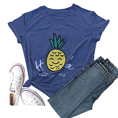 Hellopopgo Pineapple Printed Funny T Shirt Women’s Summer Tops Fruits Lover Short Sleeve Graphic Tees Tops Girl (Small, Blue-Yellow Pineapple)