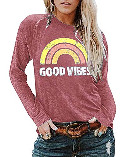 JINTING Good Vibes Graphic Tee Shirt for Women Teen Girls Long Sleeve Graphic T Shirt Top with Funny Sayings (S, Long Sleeve-Pink)