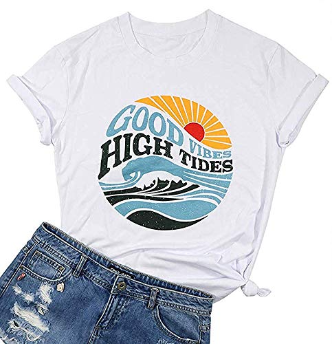 MOMOER Good Vibes High Tides T Shirt Womens Casual Letter Graphic Short Sleeve Summer Ladies Tops Tee White