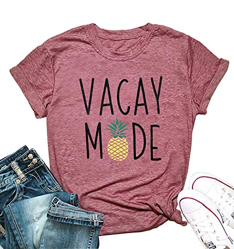 MOMOER Vacay Mode Pineapple Shirt Women Cute Graphic Tees Summer Casual Short Sleeve Letter Print Tops T-Shirts (Pink, XL)
