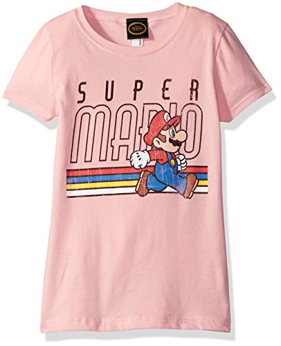 Time to make a run for your favorite video game character with the super Mario classic stripes pink girl’s tee. This cute Nintendo kids shirt has Mario running across the front and super Mario written in distressed letters printed above 4 horizontal stripes. 100 percent cotton.