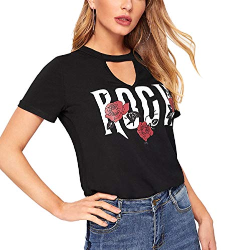 SheIn Women’s V Neck Choker Short Sleeve Junior Tops Teen Girls Graphic Tees Large Black-Rose