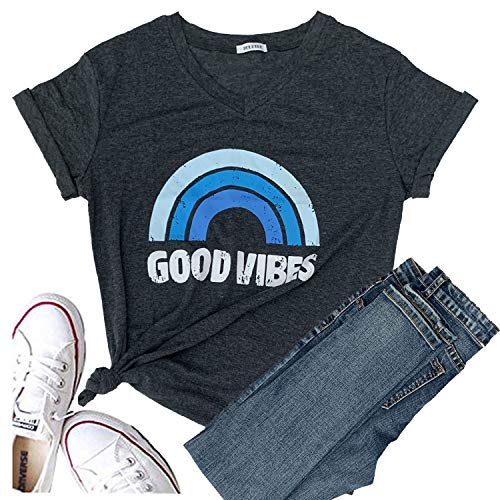 Womens Good Vibes Shirt Short Sleeve Graphic Tees Rainbow Print Funny T Shirts Cute Summer Tops V-Neck for Mom Girl Ladies (S, Blue)