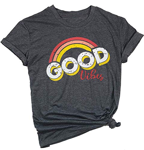YEXIPO Womens Graphic Tees Good Vibes Shirt Short Sleeve Funny T Shirts Rainbow Print Cute Summer Tops (Small, 2-Dark Grey)