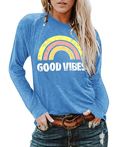 YEXIPO Womens Graphic Tees Good Vibes Shirt Short Sleeve Funny T Shirts Rainbow Print Cute Summer Tops (Small, Z-Blue)