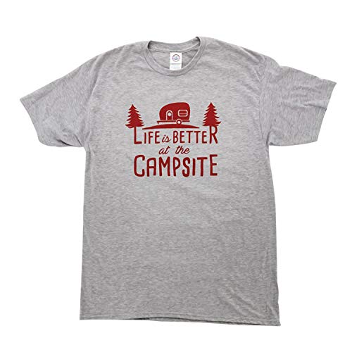 - Burgundy “Life is Better at the Campsite” printed graphic over heather gray cotton blend fabric