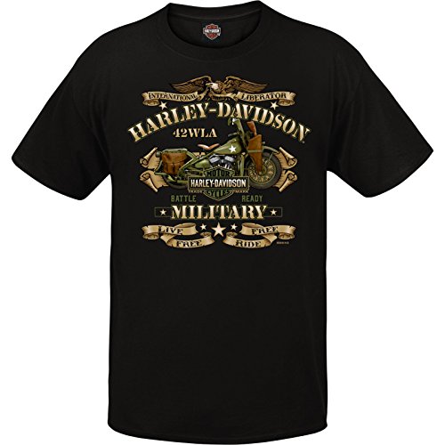 Unique, one-of-a-kind graphic designed to commemorate the long time partnership of the U.S. Military and H-D. Genuine Harley-Davidson trademarked apparel with front and back graphics, designed exclusively for H-D Military Sales. 100% Cotton. Black. Short-sleeve crew neck tee.