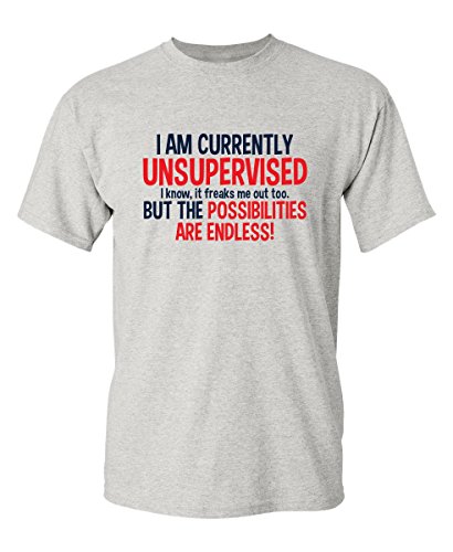 I am currently unsupervised. I know, it freaks me out too. But the possibilities area endless! Funny T-Shirt. The best part is when you pull this shirt over your head you become the center of attention. The finest quality cotton tee. They fit great, preshrunk and we only use brand name tees. The t-shirts are heavy weight cotton tees. We have over 1000 designs. Check out our store for more funny and novelty t shirts that will become your favorite.