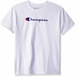 Champion boys short sleeve cotton graphic tee with graphic script Product Features Champion Boys’ Graphic Short Sleeve T-shirt Heavyweight, 6 oz. 100% cotton jersey (Light Steel is 90% cotton