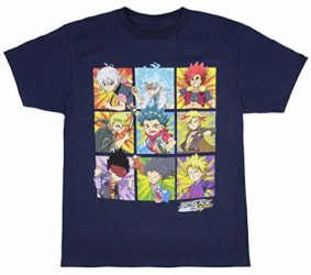Beyblade is the manga turned popular toy. Using spinning tops to battle it out in a stadium, Beyblade has become a youth favorite! This shirt features a detailed front