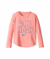 Keep her warm and looking sharp in the Nike® Kids Dri-FIT™ Logo Graphic Long Sleeve T-Shirt. Dri-FIT™ technology wicks perspiration towards the fabric surface where it can evaporate. Shirt