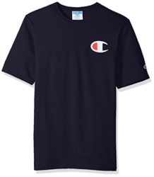 Champion Screen Logo tee. Features Champion logo screened on front left chest. Embroidered “C” patch on left sleeve. Ribbed crew neck. Short sleeves. 100% cotton. Machine wash. Imported. Product
