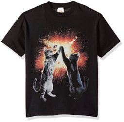 Everyone wishes their handshake could be as cool as the Lost Gods cat high five explosion black t-shirt. This funny black shirt features two cats high-pawing with an explosion