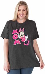 Disney Women’s plus size t-shirt with Minnie Mouse MOM print. The fabric is thin/lightweight and is a cotton/polyester blend. Machine wash cold with similar colors, inside out. Tumble dry
