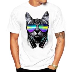 OOEOO Boy Cool Cat Print Tees Shirt Short Sleeve T-Shirt Essential Blouse Tops for Men (White, XXL)