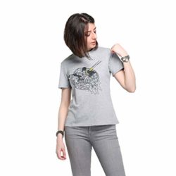 Don’t go in the water! Or do with this powder blue shirt that showcases the original Jaws movie poster. Additionally, you’ll receive two exclusive die-cut stickers: one featuring the