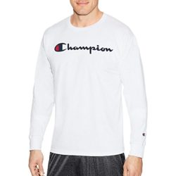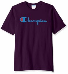 The classic Champion tee shirt. The shirt features the signature Champion script logo on the shirt and comes in a variety of colors. There is the iconic Champion embroidered