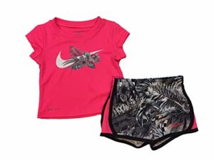 Comfortable and fun for sporty days and beyond, Nike’s two-piece set pairs a cheerful graphic-print T-shirt with breathable mesh shorts for a cute athletic look. Product Features T-shirt: crew