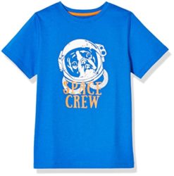 Jumping Beans Boy’s graphic t-shirt with Astronaut Suit, Moon Landing with American Flag, and Stars/Constellations Let’s Explore prints. T-shirt is 60% cotton and 40% polyester. Crew neck and short,