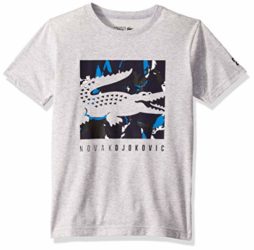 He’ll celebrate tennis great novak djokovic in casual style-even when paired with his favorite denim or chinos-in this graphic technical short-sleeve jersey tee from Lacoste. Signature Lacoste graphic crocodile