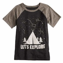 Jumping Beans Boy’s graphic t-shirt with Astronaut Suit, Moon Landing with American Flag, and Stars/Constellations Let’s Explore prints. T-shirt is 60% cotton and 40% polyester. Crew neck and short,