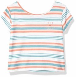 Boxy cap sleeve tee for girls. Features include: polyester viscose blend fabric, slim fit, cut snug but not too tight, boat neckline, Roxy graphic on front, product appearance may