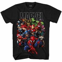 The Avengers and Guardians of the Galaxy team up on this Marvel Comics tee. Hulk, Black Panther, Vision, Rocket Racoon, Black Widow, Iron Man,Groot, Ant Man, Captain America and
