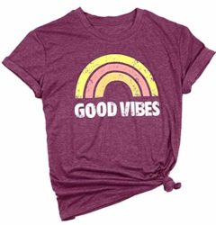 YEXIPO Good Vibes Shirt Womens Short Sleeve Rainbow Print Summer T Shirts Cute Graphic Tees Tops Unique and Chic Style Good Vibes Printing, Super Soft, Breathable Cotton Summer Casual Tee.