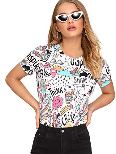 SheIn Women’s Casual Summer Short Sleeve Cartoon Graphic Tee T-Shirt Multicolored L