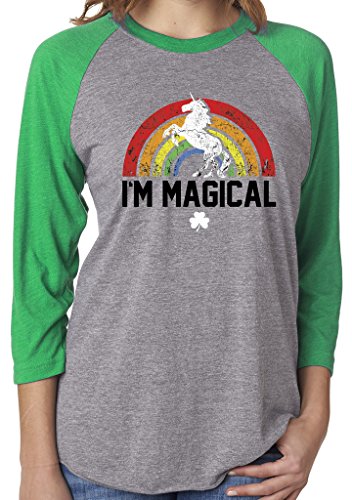 Rock the pubs and parades in this magical St Patrick’s Day shirt. PLEASE NOTE that the unisex shirt RUNS BIG- we recommend that women order a size smaller than usua for the Unisex raglan only- Please see our size chart for this item (not amazons) ………… SoRock Unisex St. Patrick’s Day I’m Magical Rainbow Unicorn 3/4 Sleeve Tri Blend Tshirt
